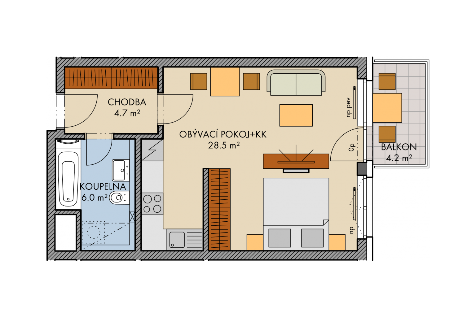 - Dům tvoří 83 nových bytů o dispozicích 1+kk (od 25,2 m2) až po 4+kk (do 119,9 m2)