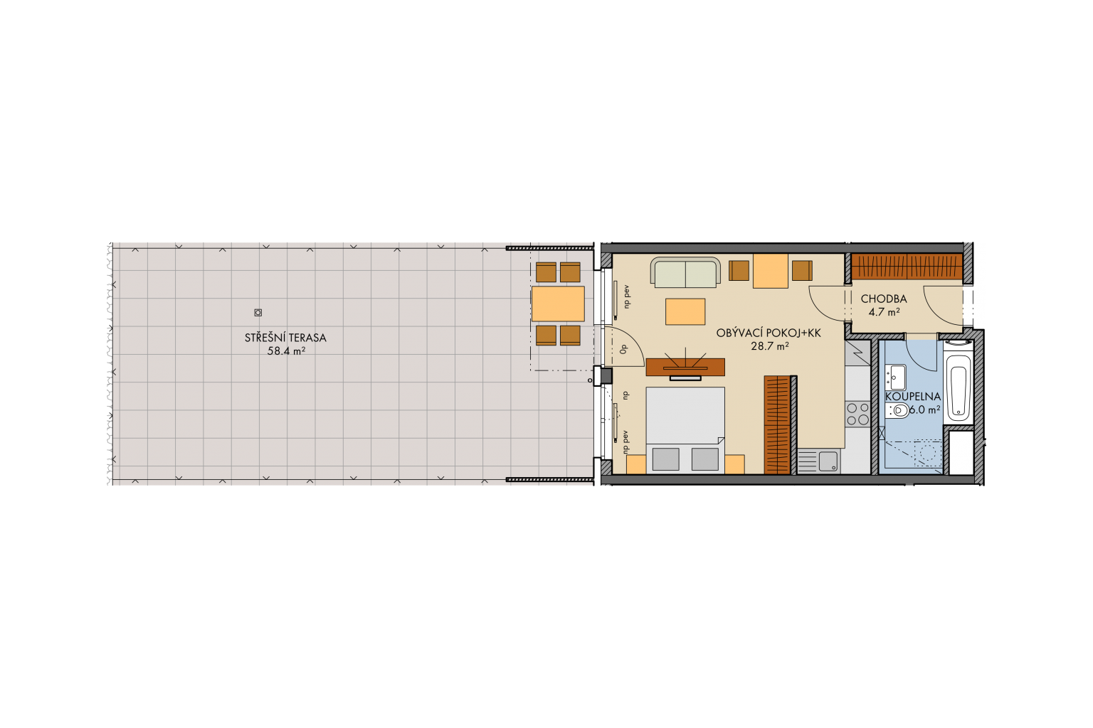 - Celkem 82 nových bytů o dispozicích 1+kk (od 25,2 m2) až po 4+kk (do 119,5 m2)