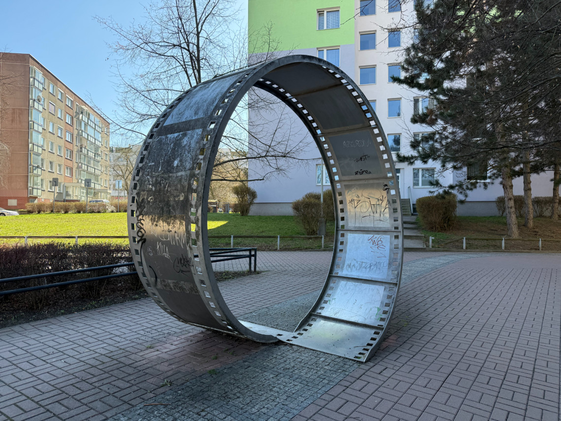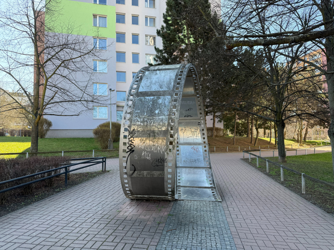 Z náměstí pokračujte podchodem na pěší trasu přes Barrandov. Po přechodu ulice Štěpařská narazíte na Filmový pás, kovovou plastiku, která nahradila zaniklé dílo z Tilleho náměstí. Už svým názvem i formou připomíná filmovou historii místa.