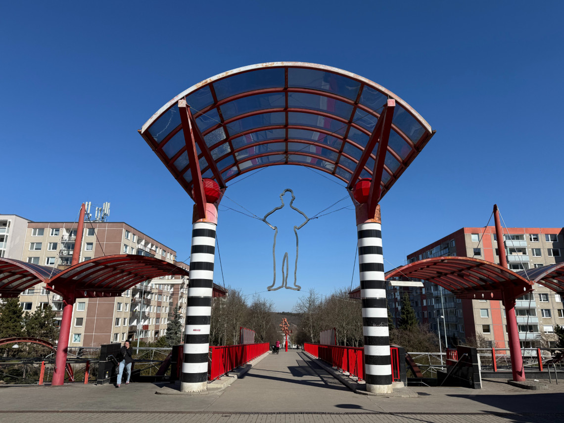Na konci mostu si můžete všimnout plastiky Kameramana od Karla Nepraše. Tato ocelová plastika je zajímavá tím, že z různých úhlů působí pokaždé trochu jinak.