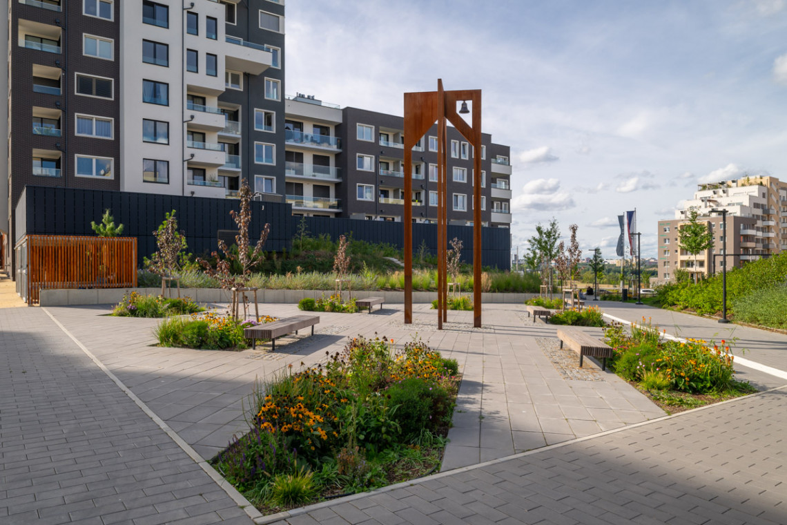 Přes ulice Hugo Haase a Gollové dojdete až na náměstí. Na prvním domě po pravé straně uvidíte Reliéf Barrandien od Lukáše Raise. Dílo může připomínat jak filmový pás, tak i vrstvení skalních reliéfů. V pravé části náměstí pak stojí další jeho dílo, Archimedon. Až bude dokončena i levá strana náměstí, objeví se tu ještě jedno další umělecké dílo.