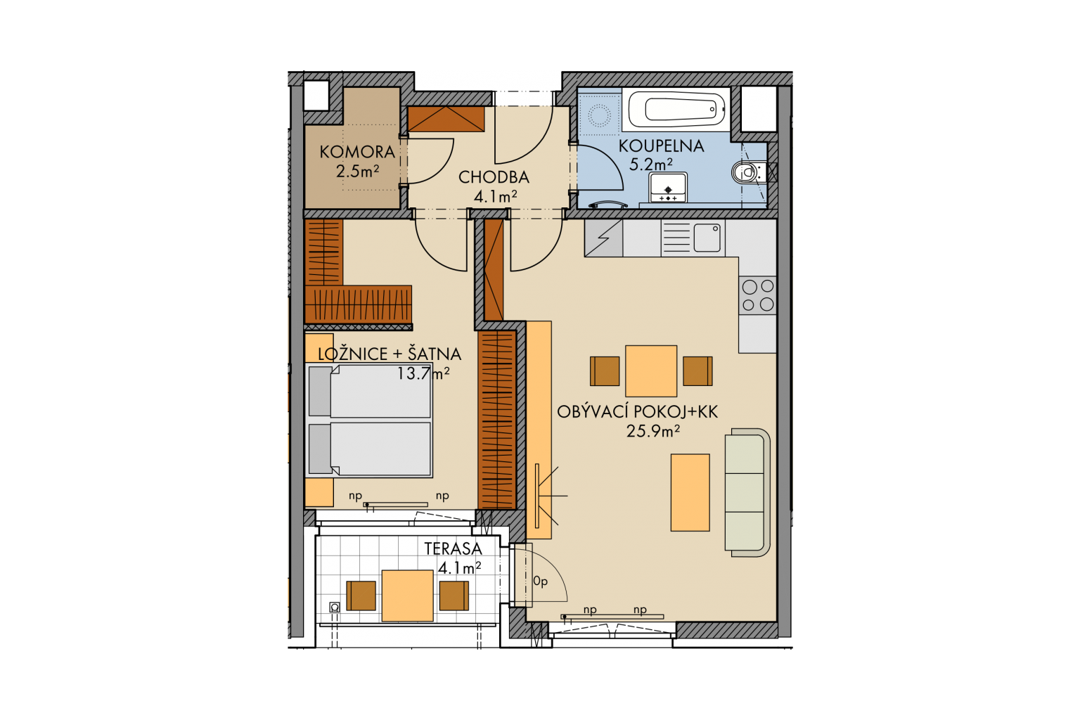 - Celkem 39 bytů o dispozicích 1+kk (od 34 m2) až po prostorné 4+kk (107,9 m2)