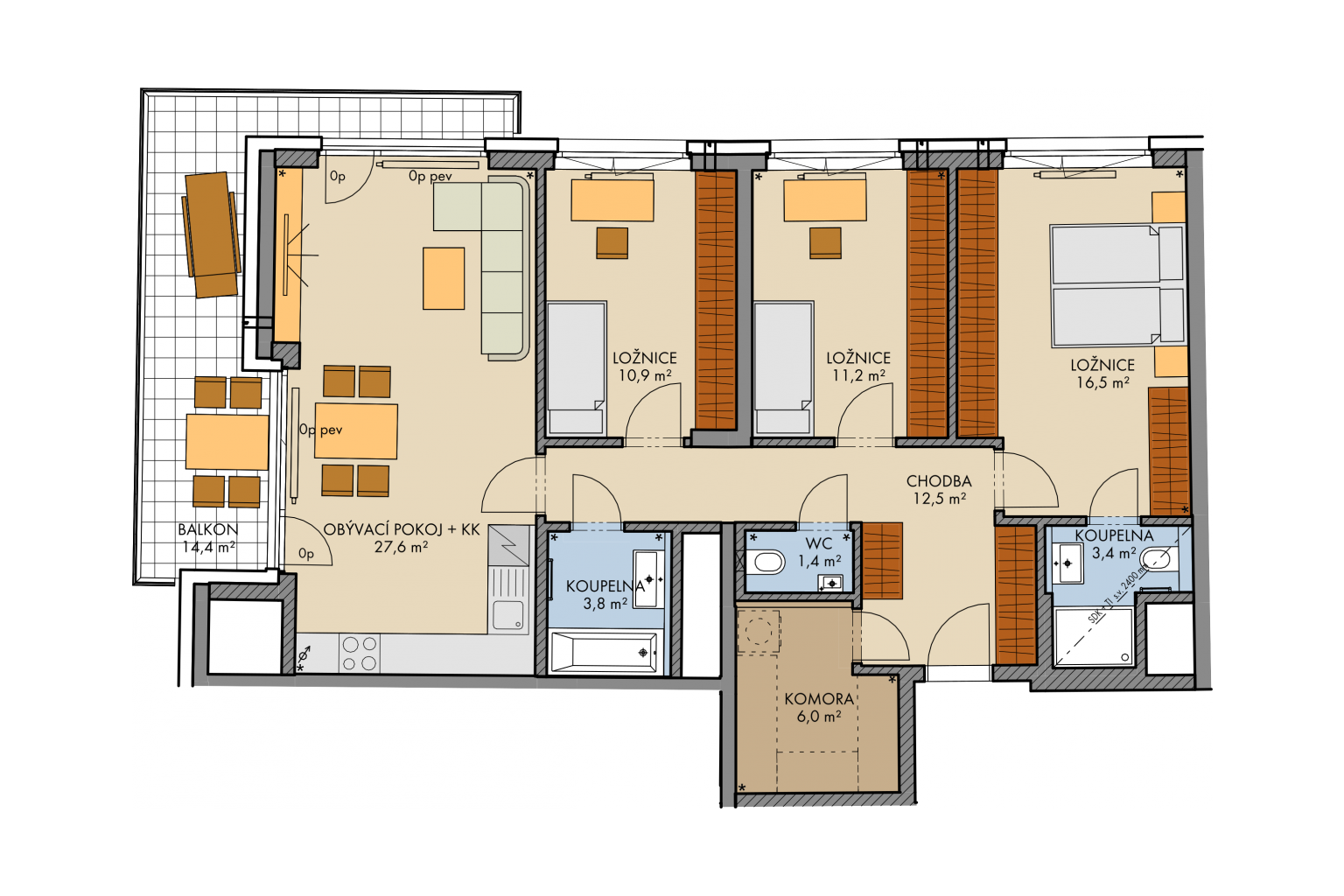 - There is 119 new apartments with the layouts of 1+kitchenette (from 25,6 m2) to more spacious 5+kitchenette (up to 116,4 m2)